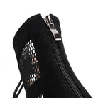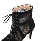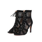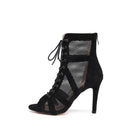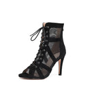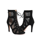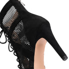 Stivali con tacco a spillo in rete con lacci e punta aperta in pelle scamosciata