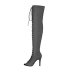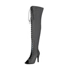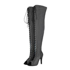 Stivali neri luccicanti con punta aperta sopra il ginocchio