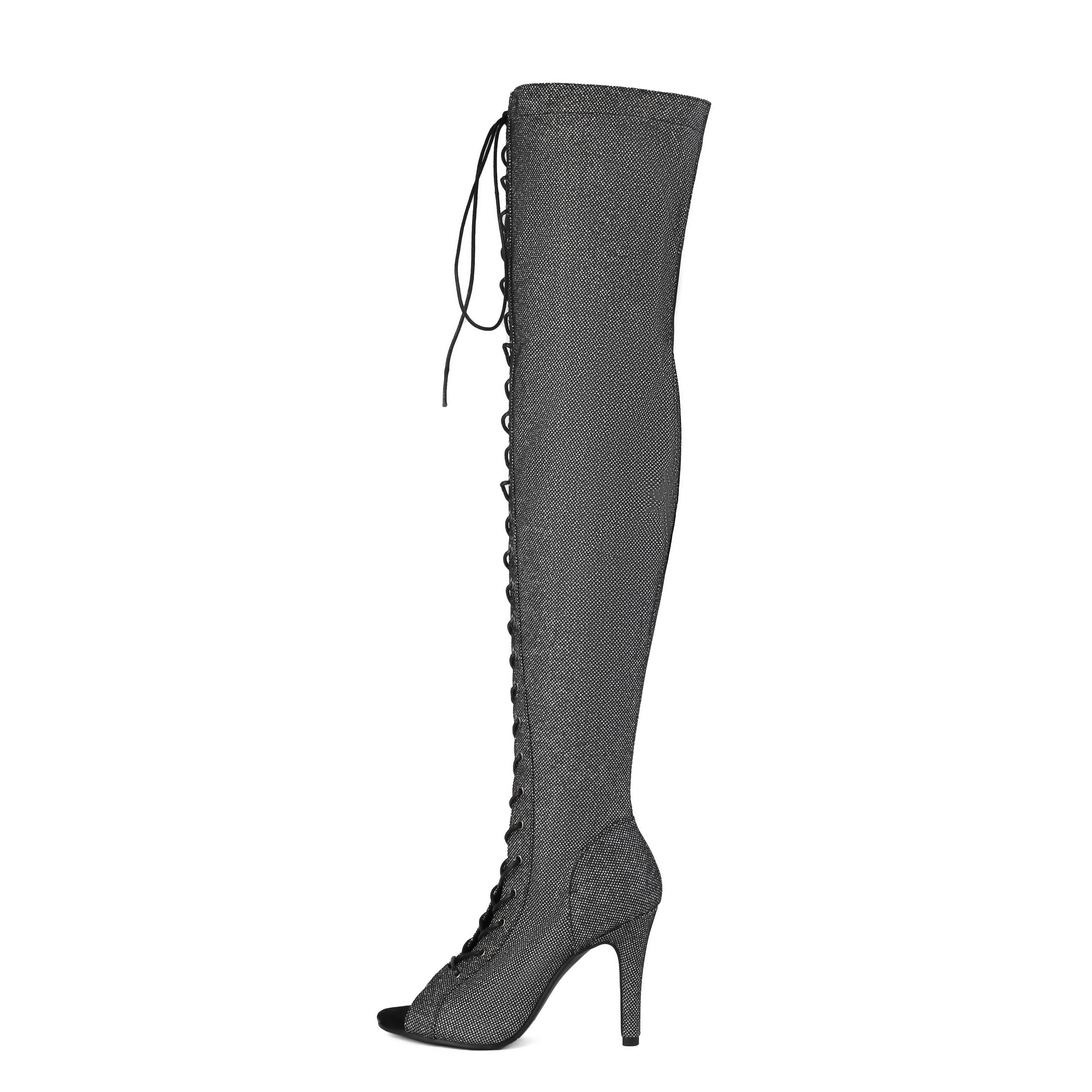 La tomaia nera scintillante risplende alla luce, mentre il design open-toe aggiunge un tocco di raffinatezza ed eleganza, garantendo al contempo traspirabilità. Questi stivali uniscono stile e praticità, pensati appositamente per la danza di tutti i giorni.