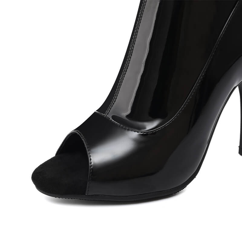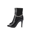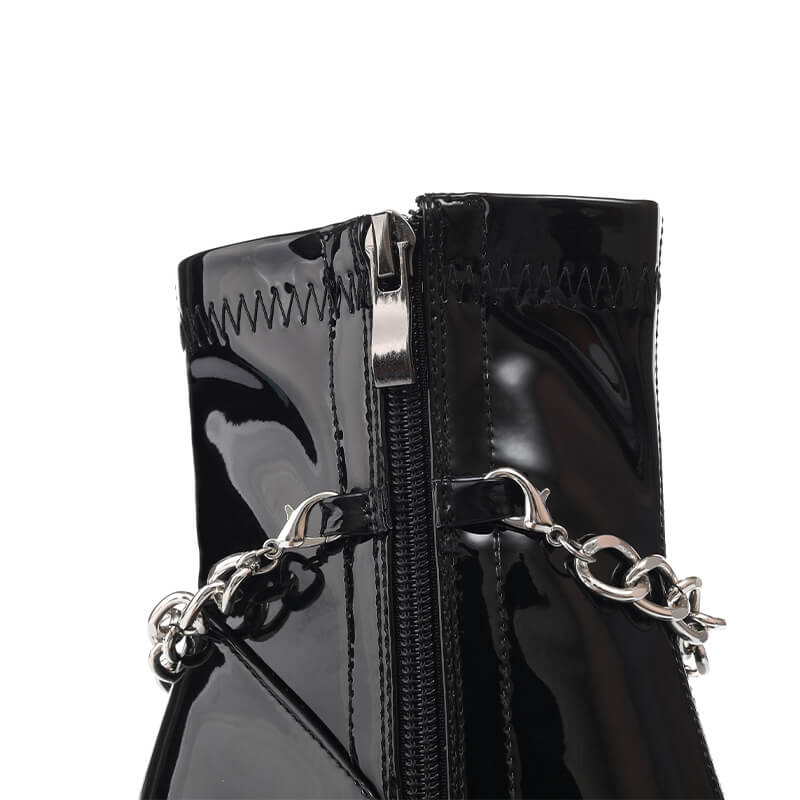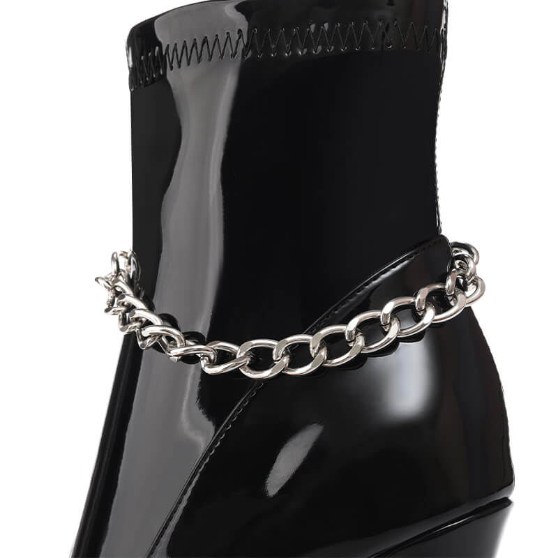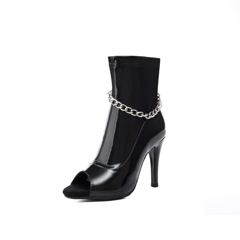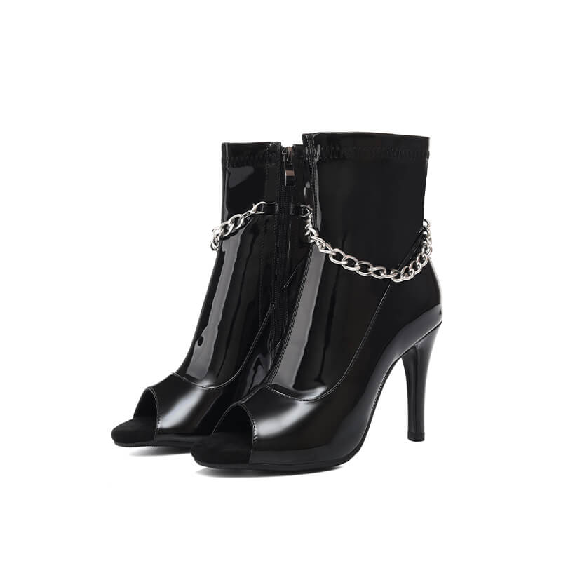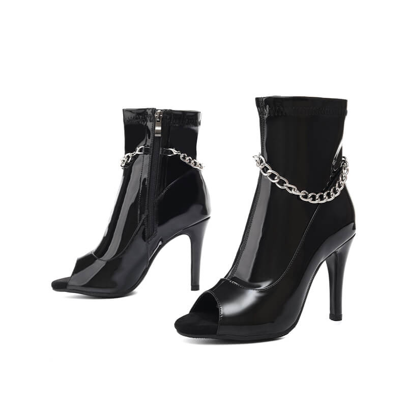 Stivali da ballo in vernice nera con tacco a spillo, cerniera sul tallone per adattarsi meglio alla forma del piede e design a catena sul lato che li rende ancora più alla moda!