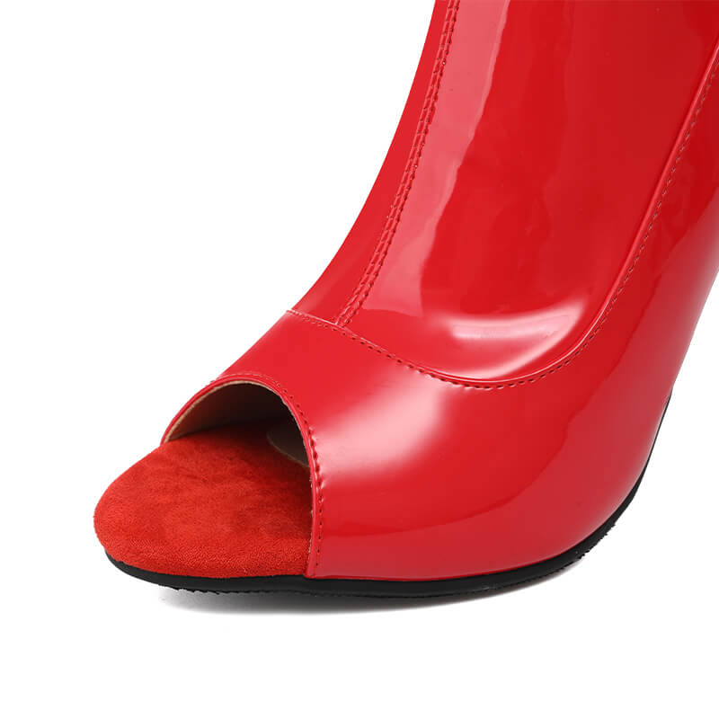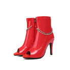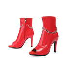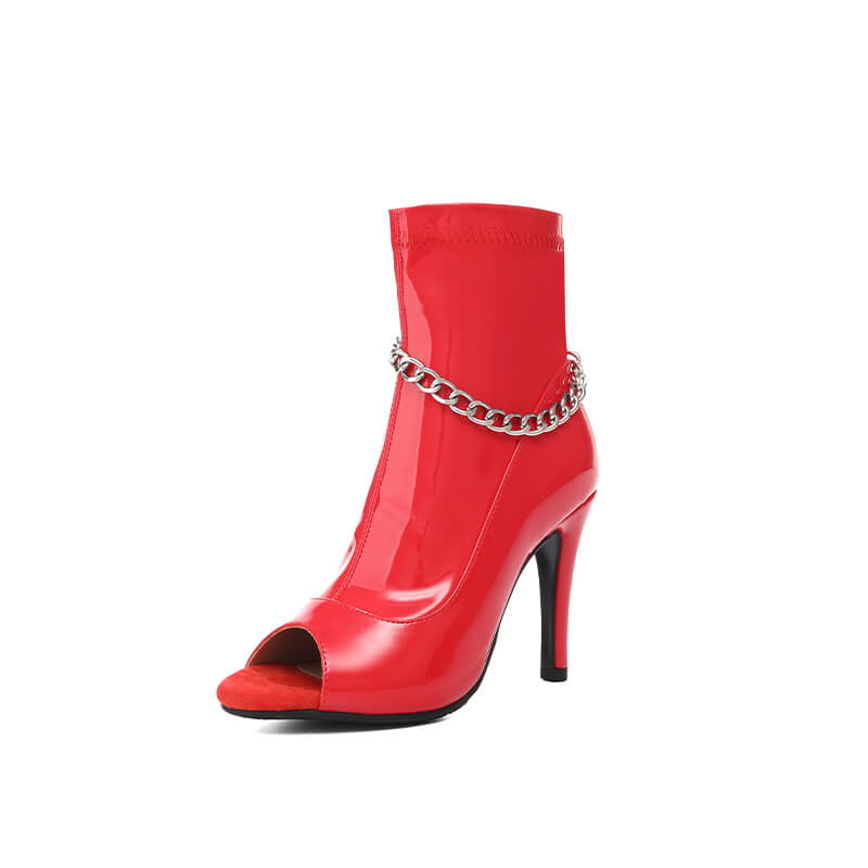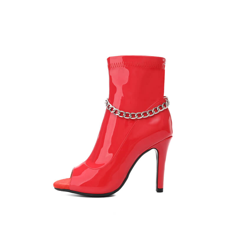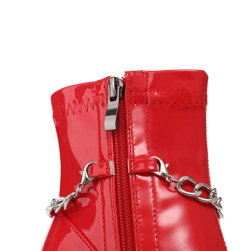 Stivali da ballo in vernice rossa con tacco a spillo, cerniera sul tallone per adattarsi meglio alla forma del piede e design a catena sul lato che li rende ancora più alla moda!